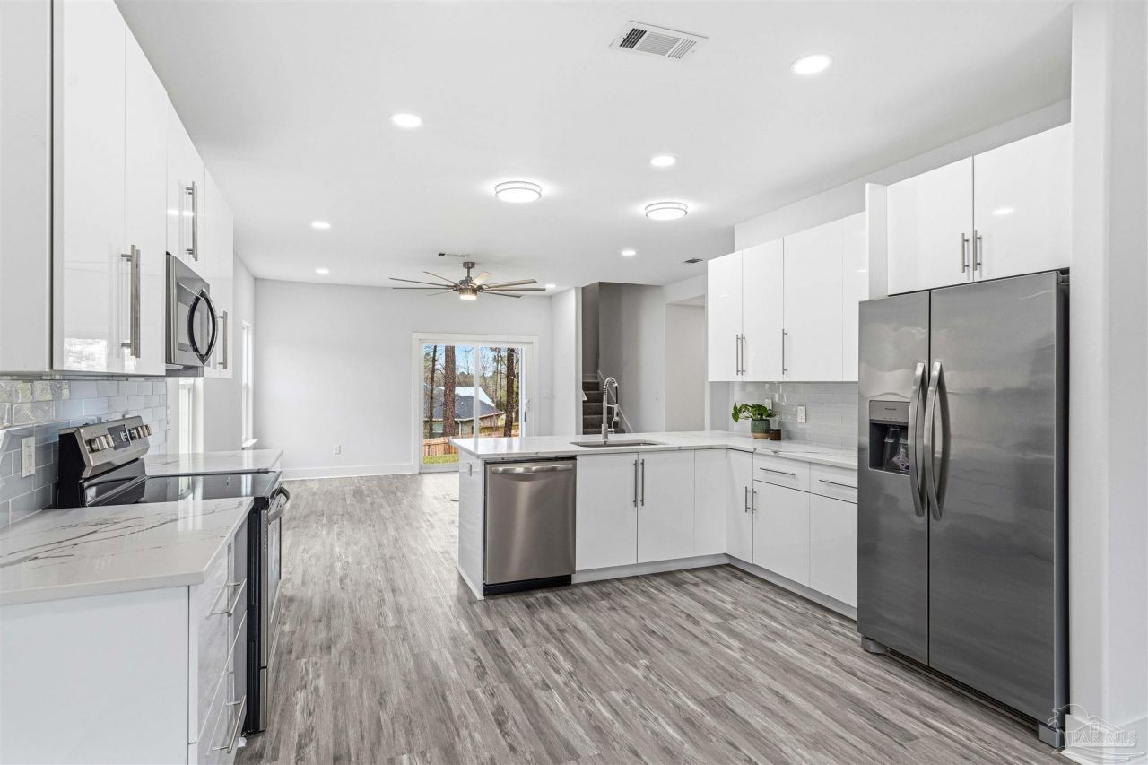 Modern design meets everyday functionality at 4446 Old Antioch Road, a thoughtfully crafted home located just 10 minutes south of I-10, offering both convenience and contemporary style. Set on a 0.32 acre homesite with no HOA, this 5 bedroom, 3.5 bath residence spans over 2,200 square feet and displays a clean European inspired aesthetic with sleek finishes and an open concept layout designed for comfortable living. The main living space flows seamlessly into a striking kitchen featuring glossy modern cabinetry, quartz countertops, stainless steel appliances, and a large center peninsula that anchors the space. The primary suite is privately...read more
